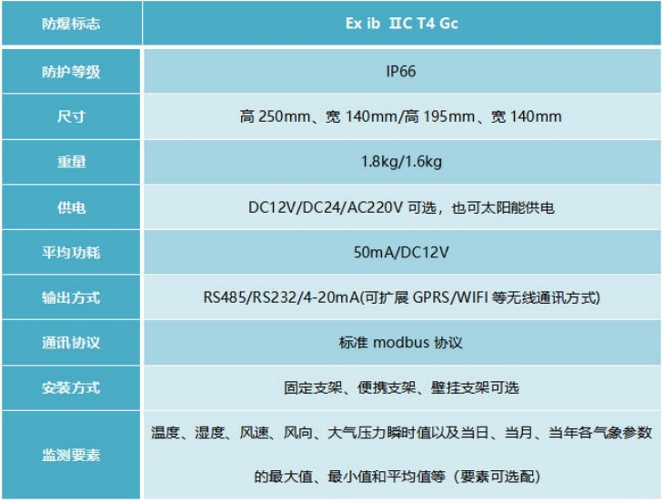 PC-8型防爆气象站是我公司根据市场需求,针对化工厂、油库等特殊场所对环境监测设备的防爆要求而研发生产的一款一体化环境监测产品。它集数据采集、存储、通讯上传于一体,再通过有线或无线的通讯方式与后台上位机管理软件或云平台对接,同时导出报表中可按照国标技术规范《GB17681—2024》,输出当日、当月、当年各气象参数的最大值、最小值和平均值等信息,供后期进行数据的处理分析。此款防爆气象站采用了防腐、防爆、防水、防震、防尘等高防护等级的设计理念,可满足各种特殊环境的使用需求,是化工厂、油库、隧道、矿井等领域的首选产品。